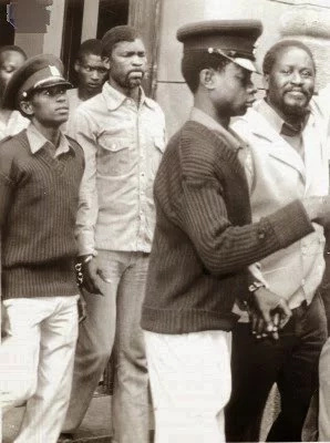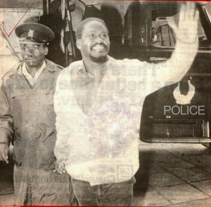 Being escorted away by a police officer in 1982 during Moi regime. Image-Jukwaa.